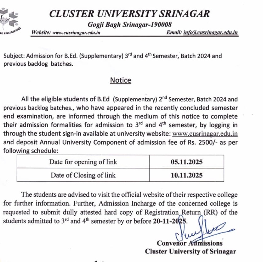 The Cluster University Srinagar (CUS) has officially opened the online admission process for B.Ed (Supplementary) 3rd and 4th Semester students of Batch 2024 and previous backlog batches.