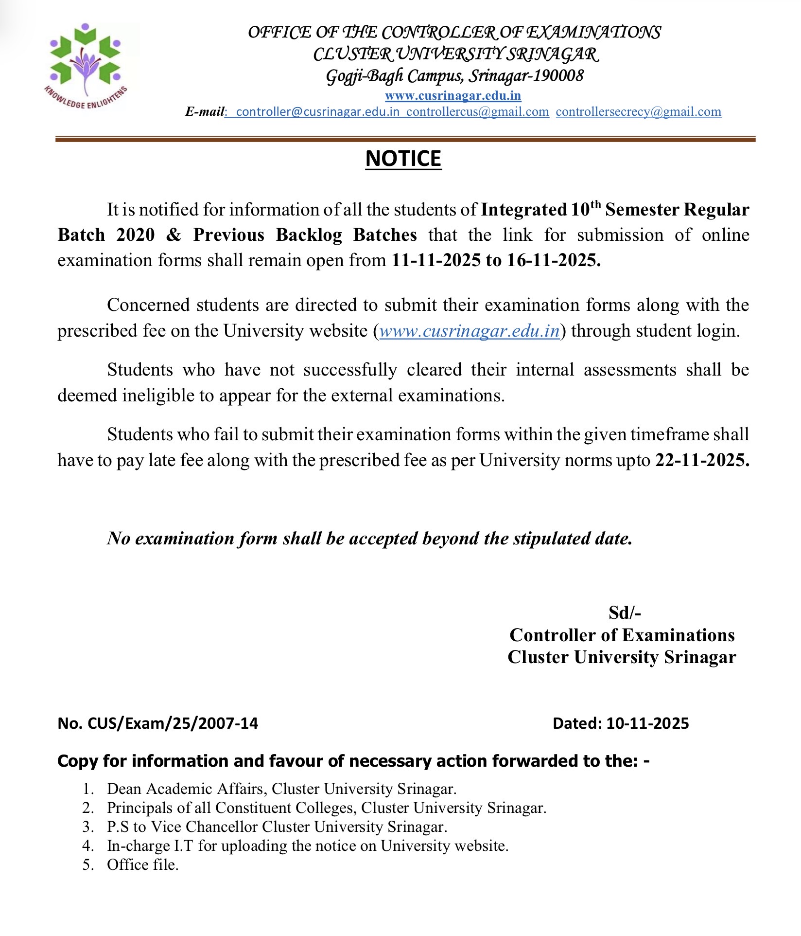 The Cluster University Srinagar (CUS) has issued two important academic notices for students of Integrated 10th Semester (Batch 2020 & Previous Backlog) and PG 4th Semester (Batch 2023).