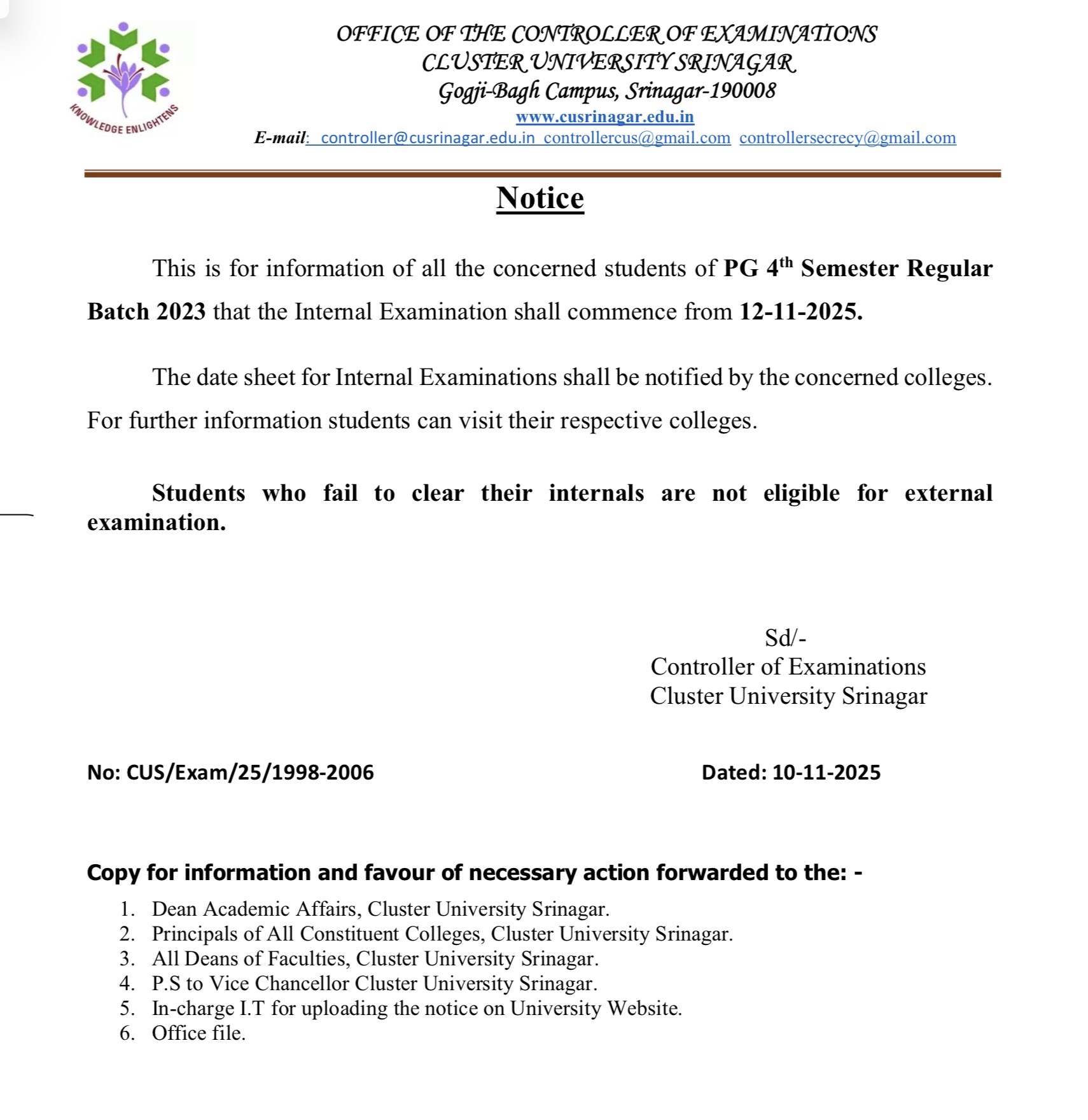 Cluster University has also notified that internal examinations for PG 4th Semester (Regular Batch 2023) will commence from November 12, 2025.