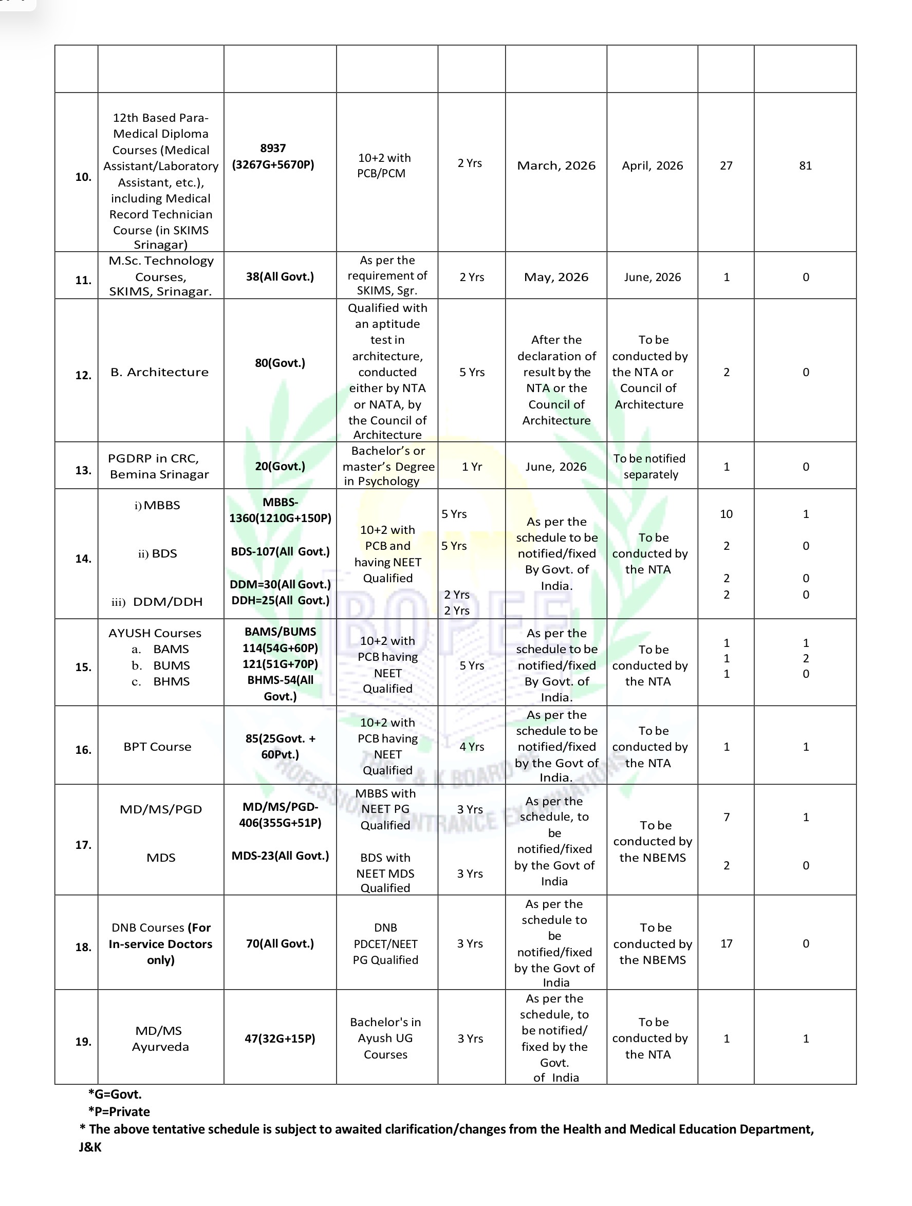 The Jammu and Kashmir Board of Professional Entrance Examinations (JKBOPEE) has issued Notice No. 002-BOPEE of 2026, dated 16 January 2026, announcing the tentative schedule for registration, entrance examinations, and seat intake for admission to various professional courses for the academic session 2026–27.